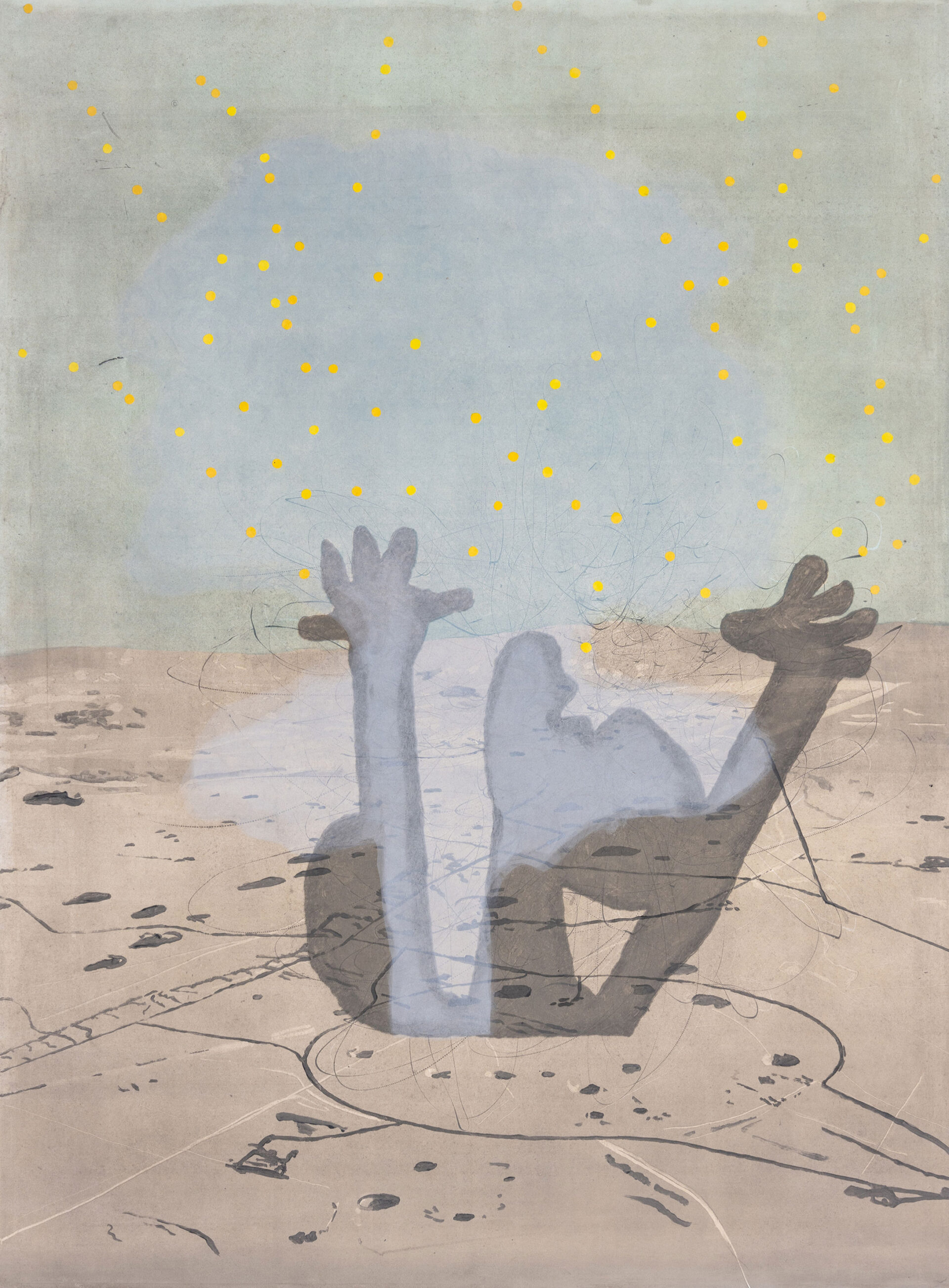 A stick figure clobbering the heavens, 2025. Collagraph, relief, monotype, collage on Evolon.