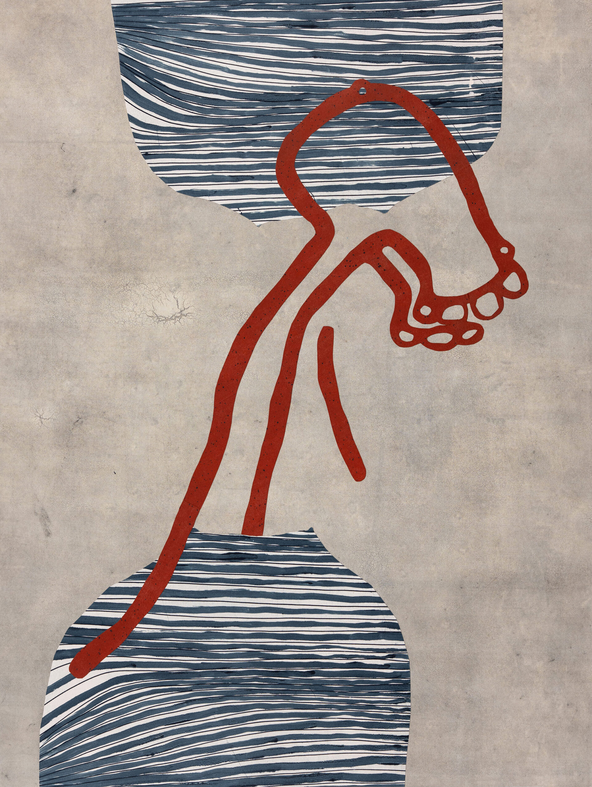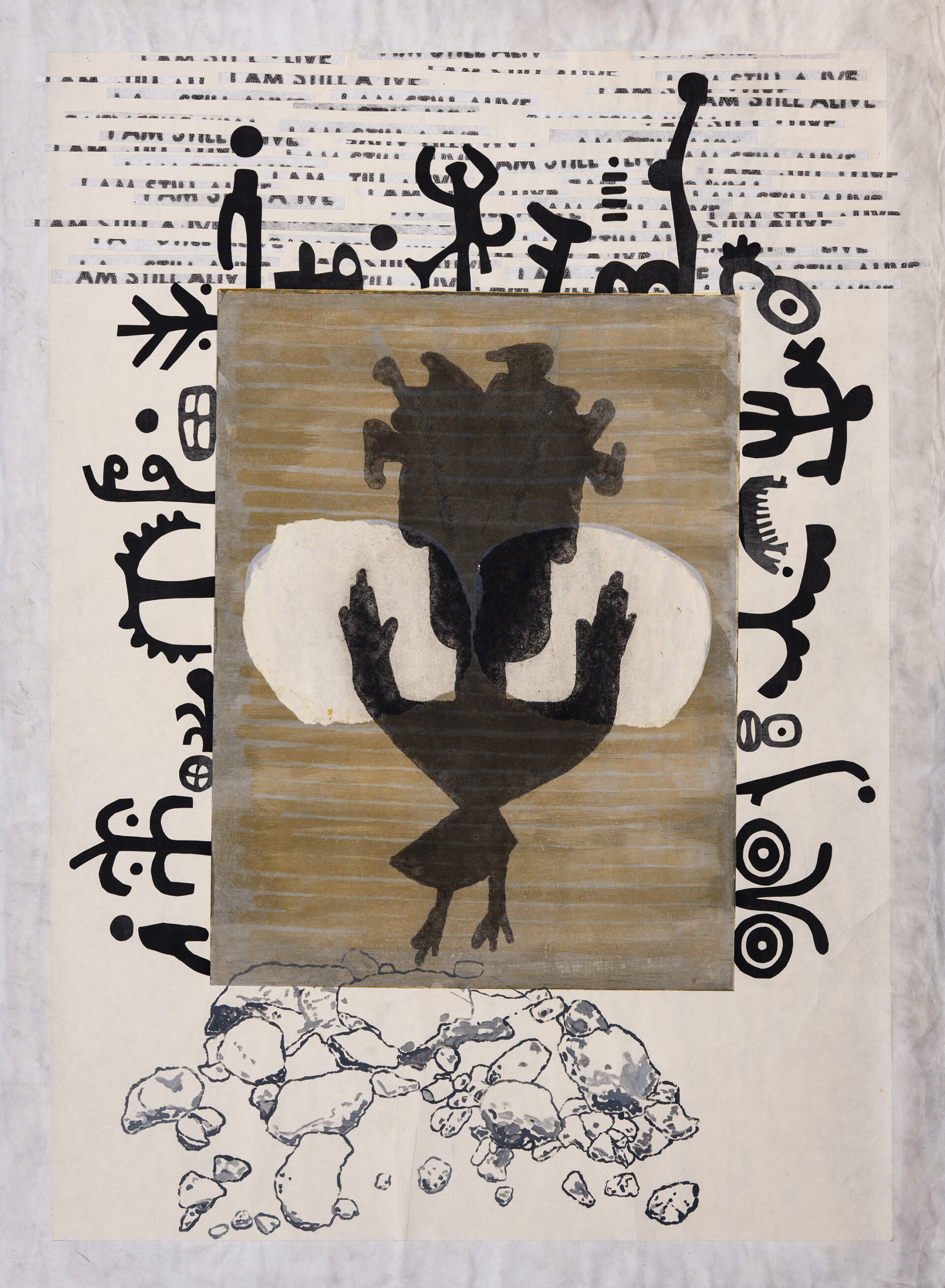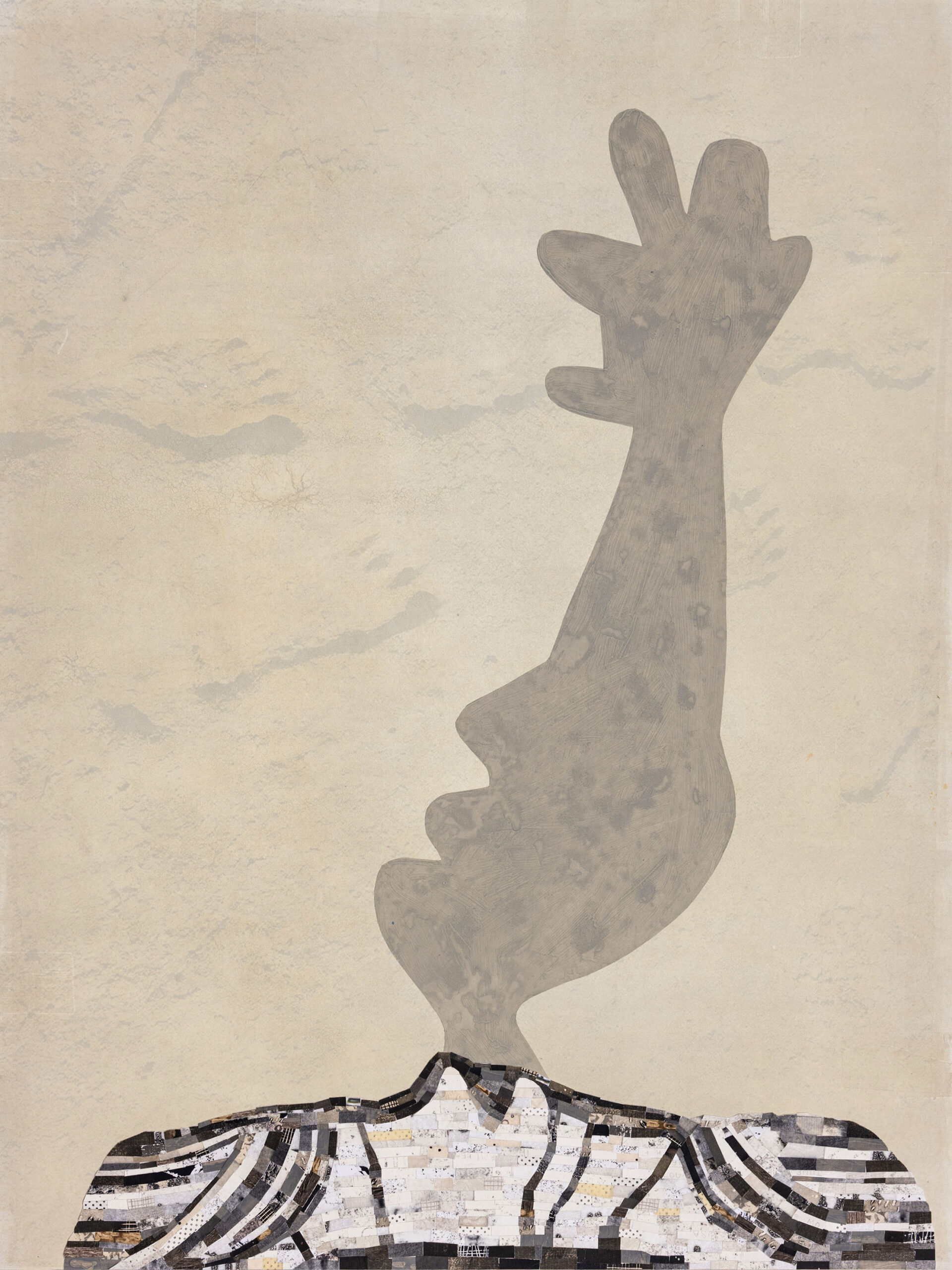 The deeper order obscured by the surface, 2024. Relief, transfer, monotype and collage on Evolon. 24 x 18 inches.