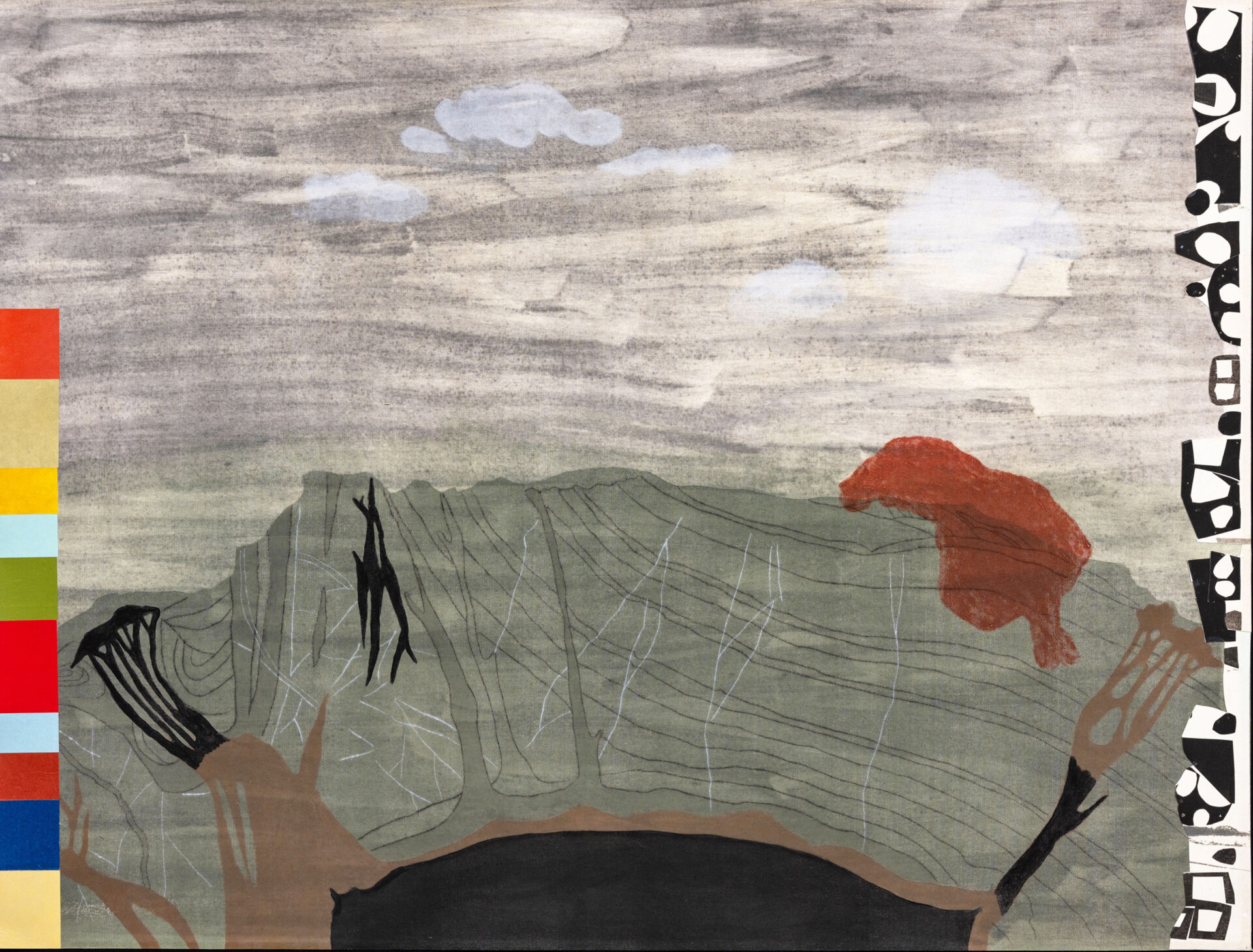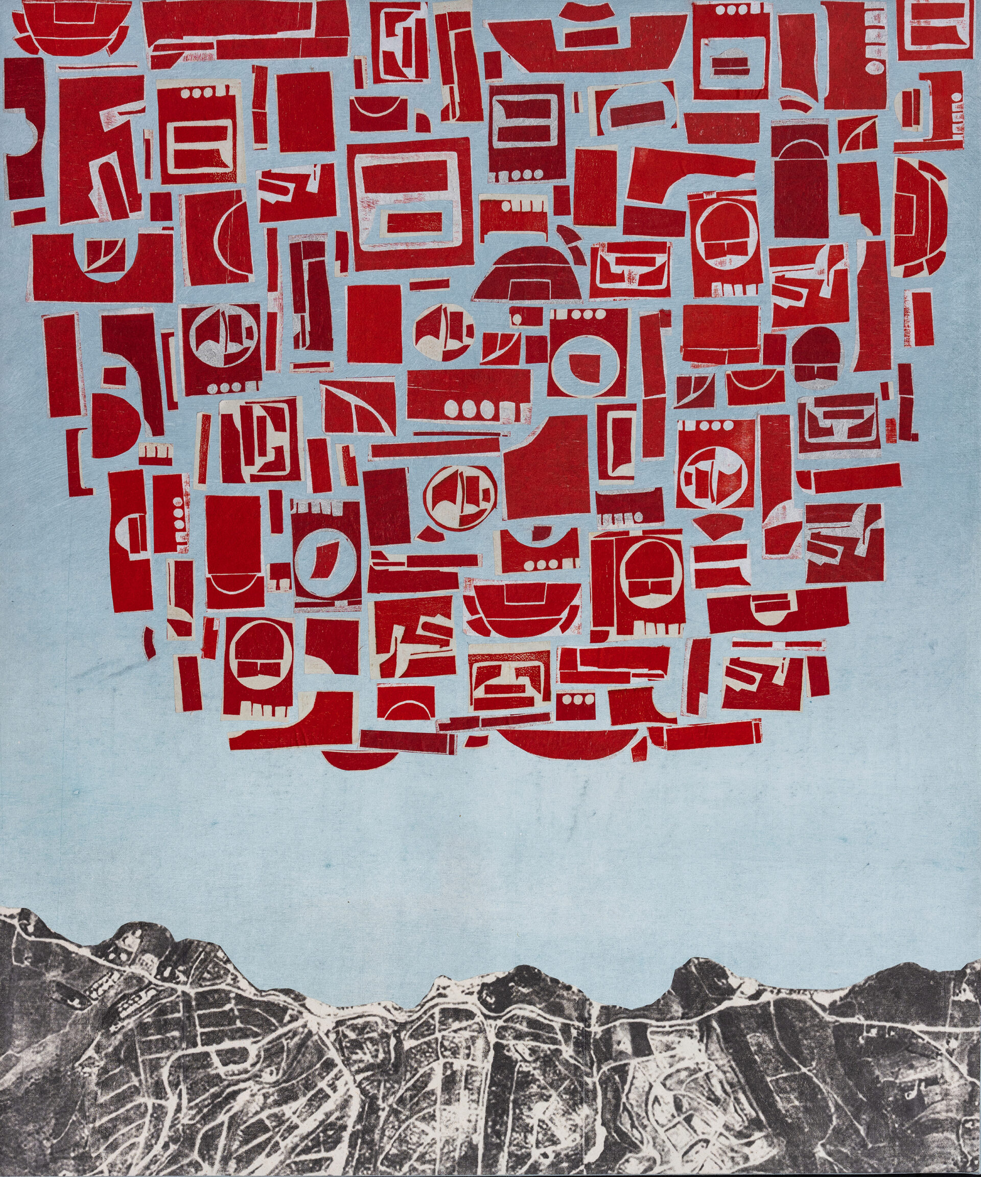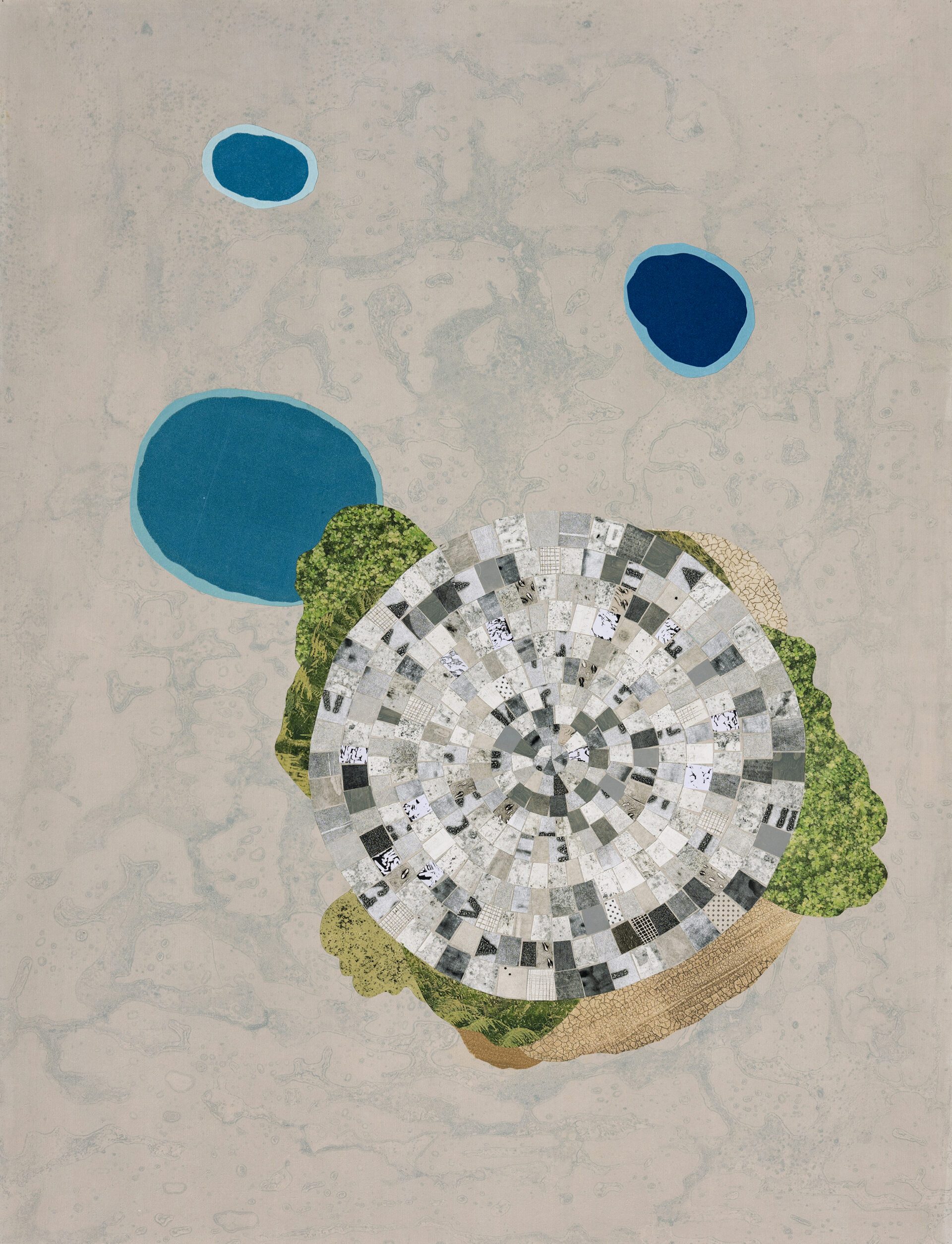 The surface of the earth and the figments of the mind, 2025. Monotype, collagraph, and collage on Evolon.